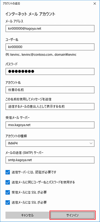 全ての入力が完了したら「サインイン」→「完了」とクリックして設定が終了です。