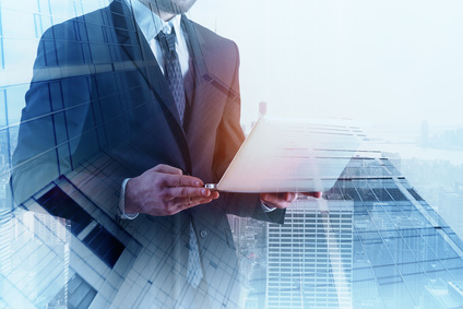 高層ビルの背景の前に立つノートパソコンを持ったスーツの男性
