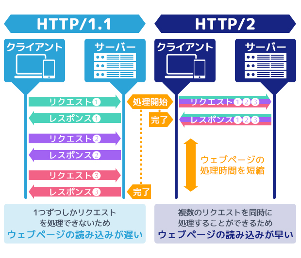 一方、新しく登場したHTTP/2では、複数のリクエストを同時に処理することができます。先ほどの例にあてはめると、仮にウェブページに2つの画像があれば、その2つを同時に読み込むことができるわけです。これにより通信の効率が改善し、ウェブページの読み込みが早くなります。