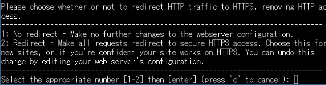 - リダイレクト設定する場合は2を選択(httpへのアクセスを自動的にhttpsに転送)
