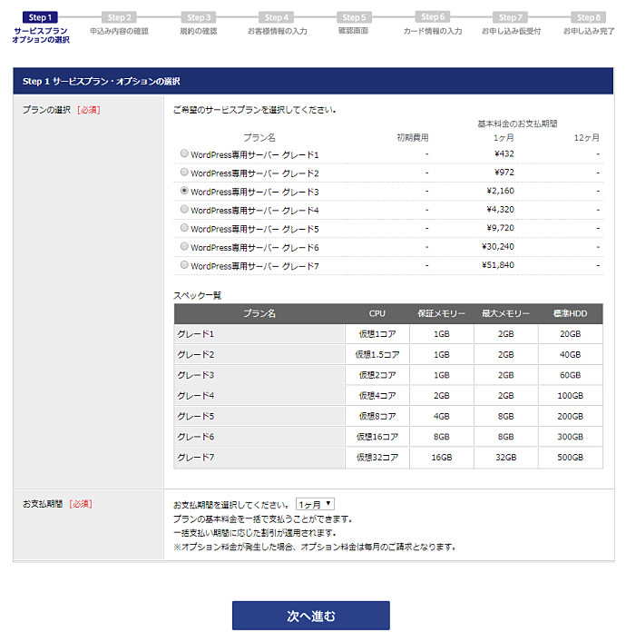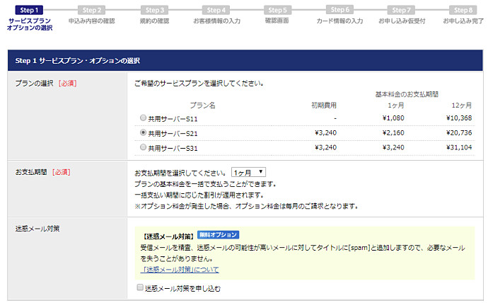 全部で8ステップに分かれています。画面の説明内容を確認しながら、必要事項を入力する必要があります。共用サーバーとはプラン名が異なりますが、ステップ数は同じです。