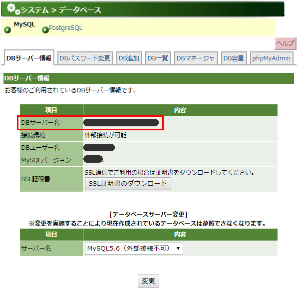 | 操作画面 | ( コントロールパネル > システム > データベース > MySQL ) |