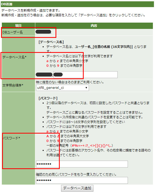 データベース名とパスワードを入力して、「データベース」追加ボタンをクリックします。次に、DBユーザー名、データベース名そしてパスワードもメモしておきます。