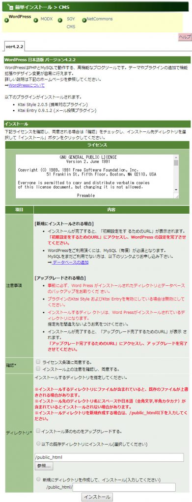 ライセンスと注意事項を確認してから、チェックボックスをチェックします。次にインストールするディレクトリを指定します。最後に画面最下部の「インストール」ボタンをクリックします。