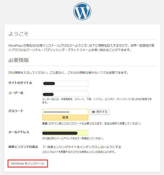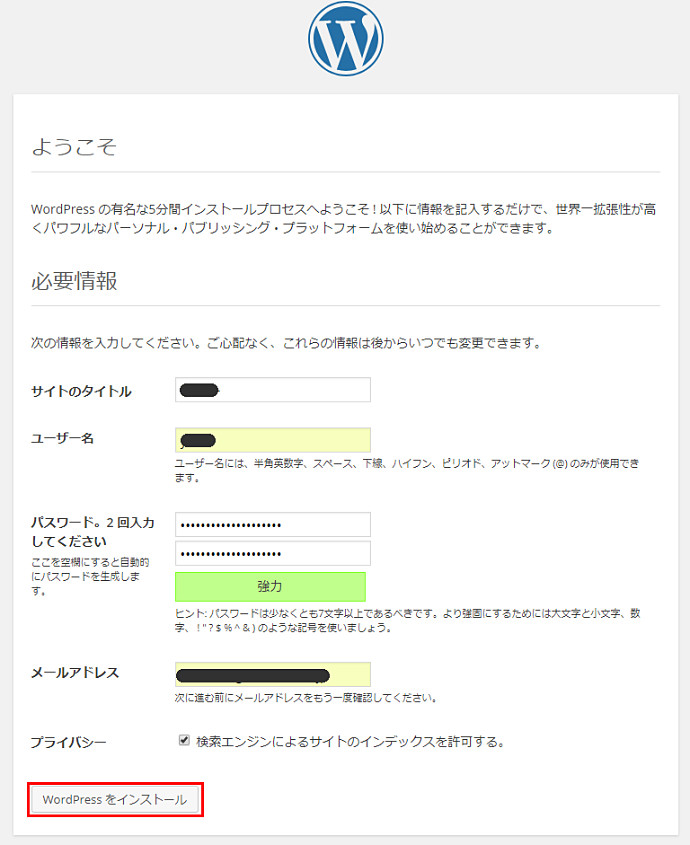 「タイトル」「ユーザー名」「パスワード」「メールアドレス」を入力してから、画面最下部の「WordPressをインストール」ボタンをクリックします。