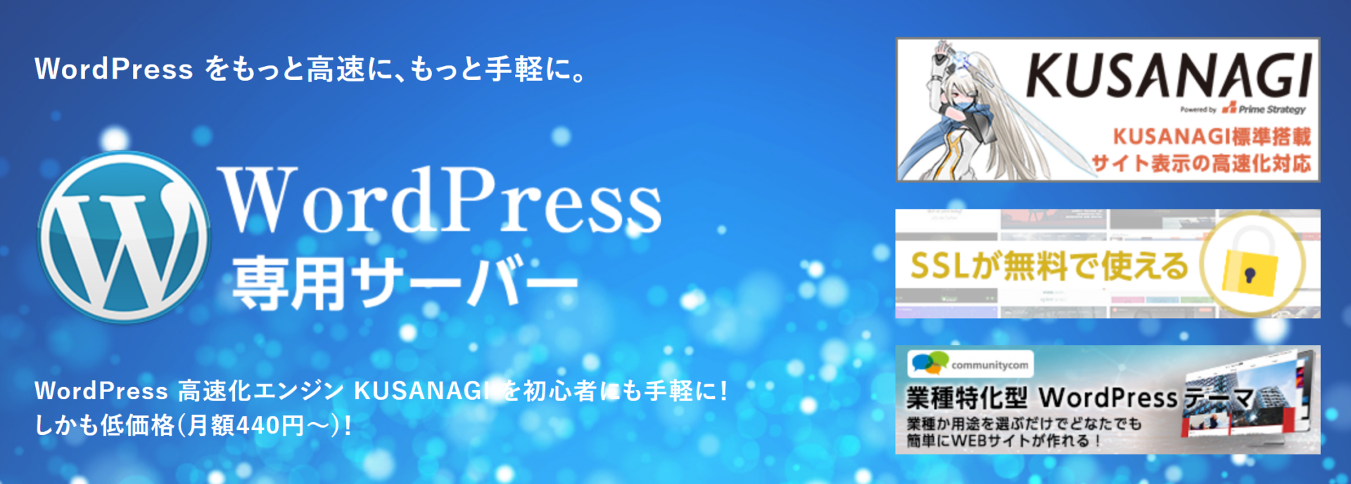 | 高速化の手段 | (1) KUSANAGI *注1 *利用料は月額料金に含まれる (2) ストレージはSSD使用 | なし |