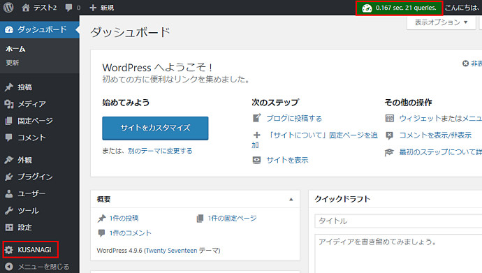 通常のWordPressダッシュボードに比べて、赤枠の部分が追加されています。こちらによりKUSANAGIが適用されていることがわかります。