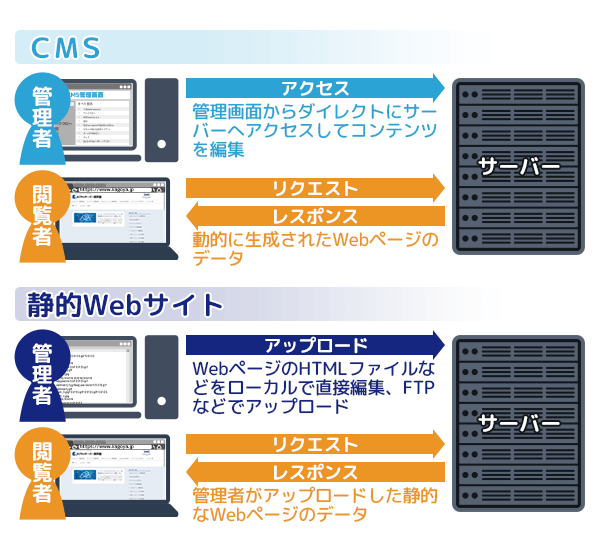 | 更新方法 | ブラウザで専用の管理画面にアクセスして実施 | 作業者がHTMLなどを修正し、そのあと専用ソフト(FTPなど)でサーバーへアップロード |