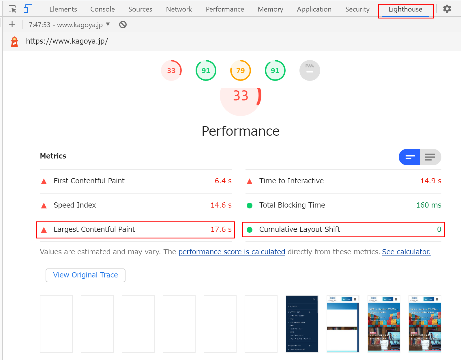 LighthouseはWebページの品質をチェックできる、Google Chromeの拡張機能です。LCPとCLSのほか、FIDに関連するTBT(Total Blocking Time)を計測できます。TBTとはユーザーの操作に対する応答がブロックされている時間の合計です。