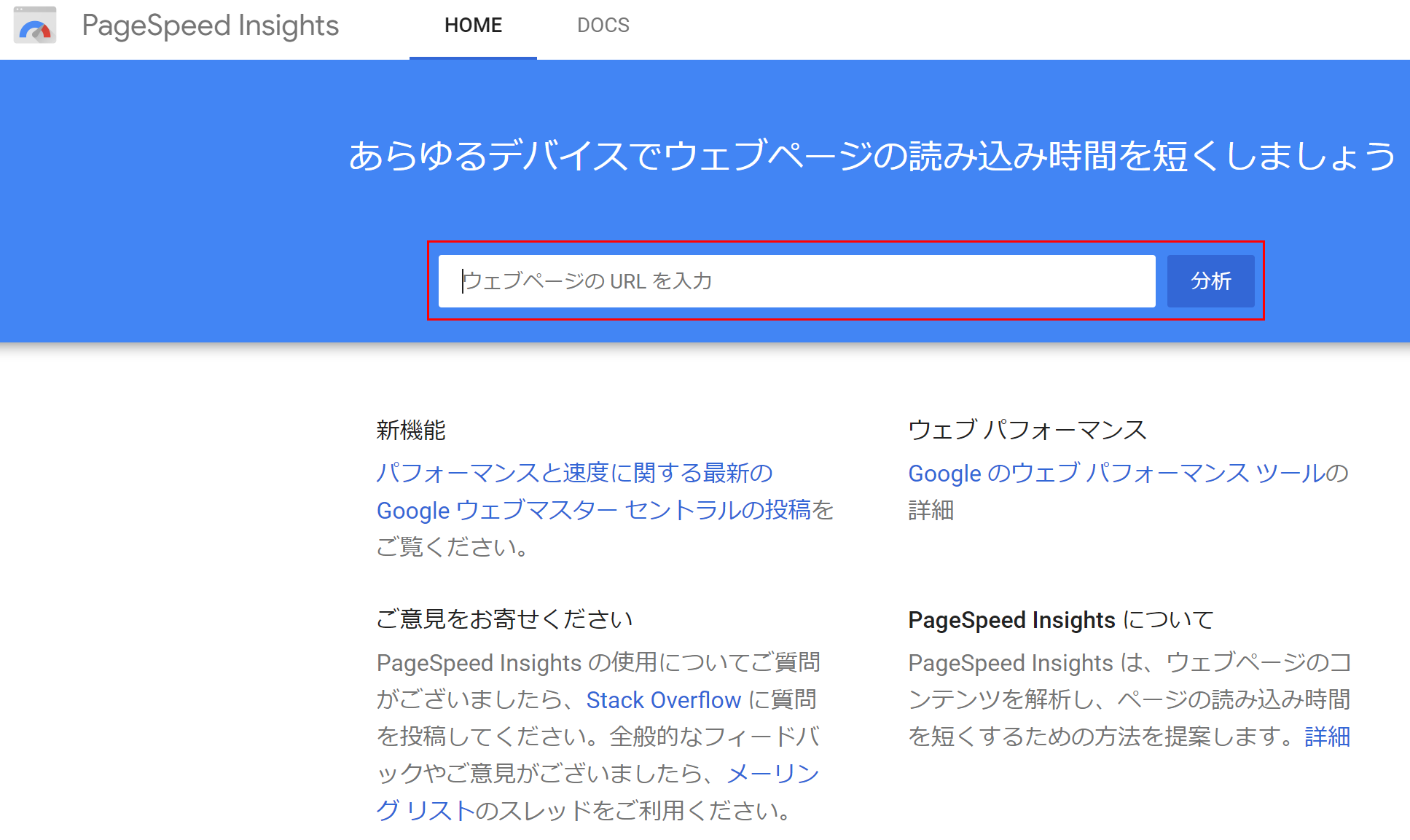 Google社が提供するPage Speed Insightsは、Webサイトの読み込み速度を測定するツールです。ブラウザでPage Speed Insightsへアクセスし、測定対象のURLを入力の上で「分析」ボタンを押すだけで、コアウェブバイタルの各指標を計測できます。