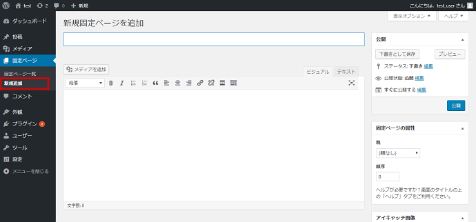 すると、固定ページの作成画面に移動しますので、そこでタイトルや本文、URLにアイキャッチ等を作成・設定し「公開」ボタンを押せば固定ページが生成され、外部からもアクセスできるページとなります。