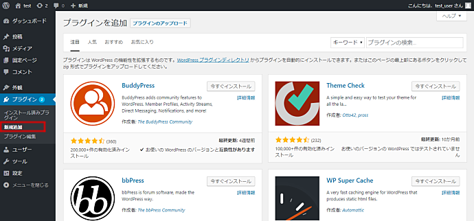 なお、プラグインの探し方についてもWordPressの管理画面内にある「プラグイン」→「新規追加」に移動することで、そこにある検索窓からプラグインの検索を行うことができます。