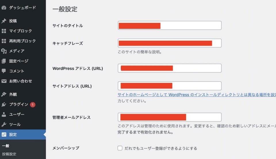 管理画面から設定を行う場合は、「設定」→「一般」に移動した場所から設定、変更が可能です。また、そこでサイトのキャッチフレーズも設定することもできます。