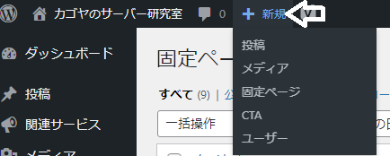 手順としては、WordPress管理画面の上部にある「+新規」にマウスカーソルを合わせると、新規で作成できる一覧が出現しますので、ここから固定ページを選択します。