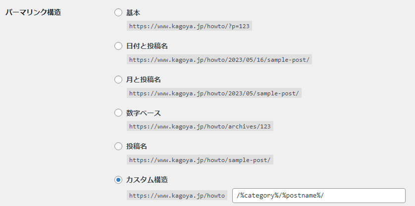 おすすめは「カスタム構造」です。「カスタム構造」であれば記事毎に自分で最適な文字列にすることができるため、URLを見ただけどういったコンテンツなのか推測しやすくなり管理が楽になります。