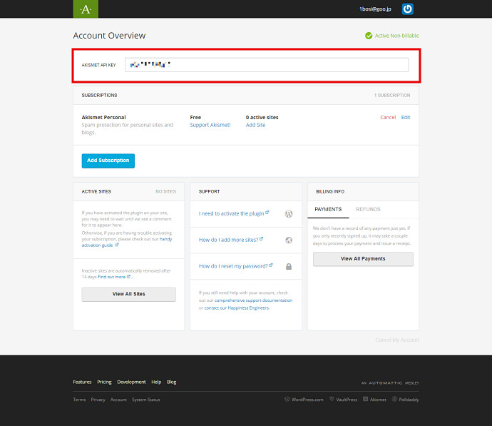- この中に表示された「AKISMET API KEY」が設定の際に必要です。画面をコピーするか、メモに取っておいてください。すぐに設定を続けるのであれば、コピー&ペーストできるように、コピーしておくと便利でしょう。