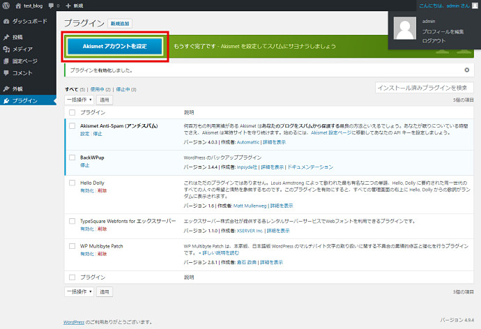 - Akismetプラグインを有効化します。WordPressの管理画面にログインし、「プラグイン」メニューをクリックしてください。