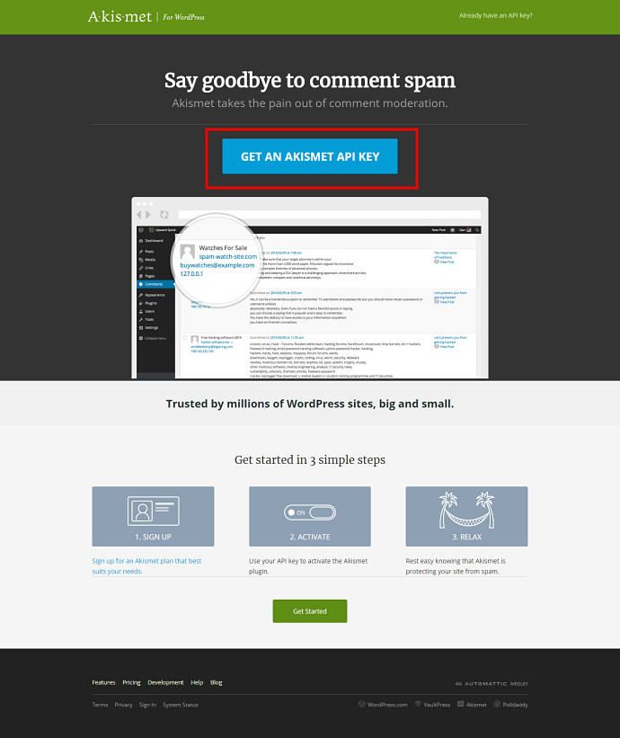 - Akismet.comのウェブサイトに遷移します。「GET AN AKISMET API KEY」をクリックします。