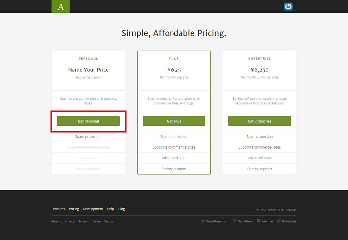- Akismet.comのウェブサイトに戻ります。Akismetのプラン一覧が表示されます。無料で利用するため、その中から「Name Your Price」プランにある「Get Personal」ボタンをクリックしてください。