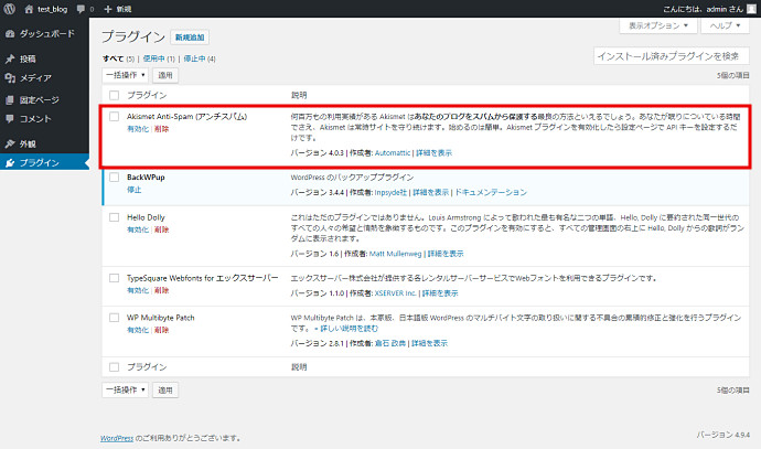 - プラグインの一覧に「Akismet Anti-Spam」が表示されています。(WordPressのバージョンによっては「Akismet」とだけ表示されていることもあります。)その下に表示されている「有効化」をクリックします。