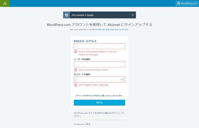 - WordPress.comのウェブサイトに遷移します。Akismetの利用にあたって、WordPress.comのアカウント(無料)が必要です。画面の指示にあるようにメールアドレス・ユーザー名・パスワードを入力し「続ける」をクリックします。