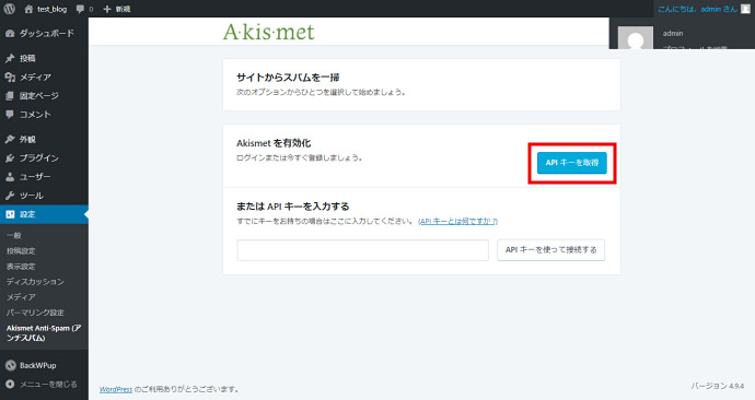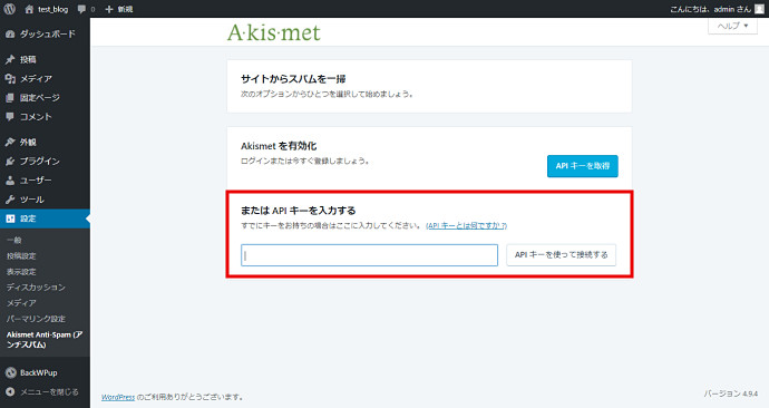 - 次にWordPressの管理画面へ戻り、プラグインからAkismetの「設定」メニューを表示します。「またはAPIキーを入力する」と表示された欄に先ほどのAPI KEYをペースト(入力)して「APIキーを使って接続する」をクリックします。