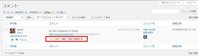 - また、スパムコメントにマウスポイントをあわせることで、そのメッセージを削除(「完全に削除する」をクリック)したり、承認待ちに戻したり(「スパム解除」)することもできます。