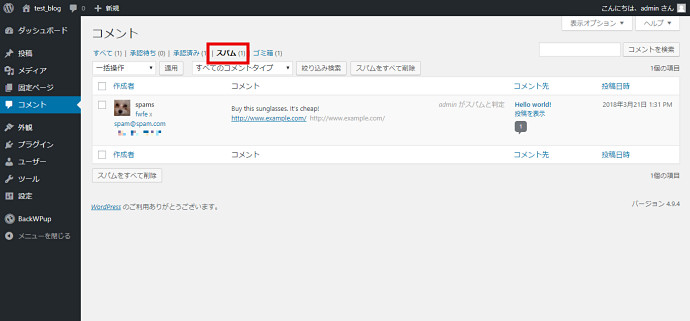 - Akismetによってスパムと判定されたコメントは、コメントメニューの「スパム」フォルダに振り分けられています。WordPress管理画面から「コメント」→「スパム」へ移動すると、以下の通り、スパムコメントの一覧や内容を確認することが可能です。