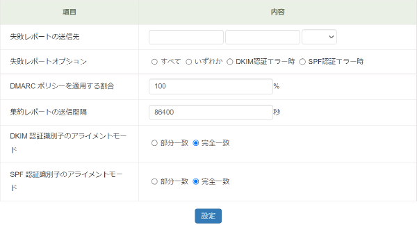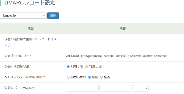自社のなりすましメールの取り扱いを「何もしない/隔離/拒否」といったDMARCポリシーを設定します。