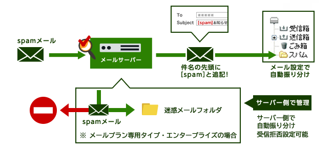 これまでの迷惑メールフィルター機能では、迷惑メールの可能性が高いと判断されたメールの件名に[spam]という文字列を追加してお届けし、お客様にてメールソフト側で振り分け設定を行っていただいていました。