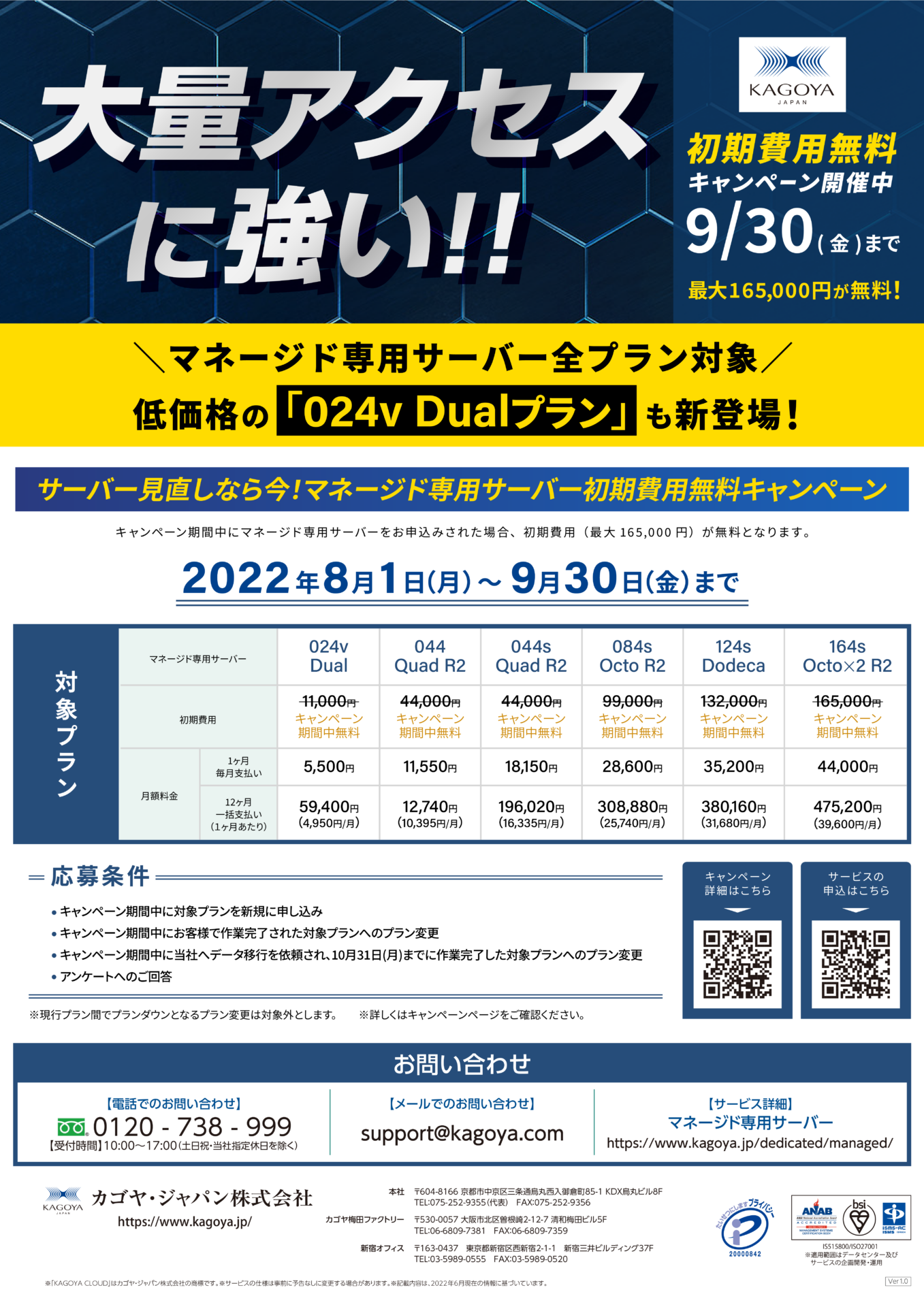 キャンペーン期間中にマネージド専用サーバーをお申し込みされた場合、初期費用(最大 165,000円)が無料となります。