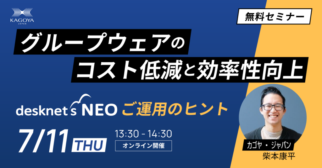 カゴヤ・ジャパン株式会社(本社:京都府京都市、代表取締役社長:岡村 武)は、2024年7月11日(木)に無料オンラインセミナー「グループウェアのコスト低減と効率性向上~desknet’s NEOご運用のヒント~ 」を開催します。