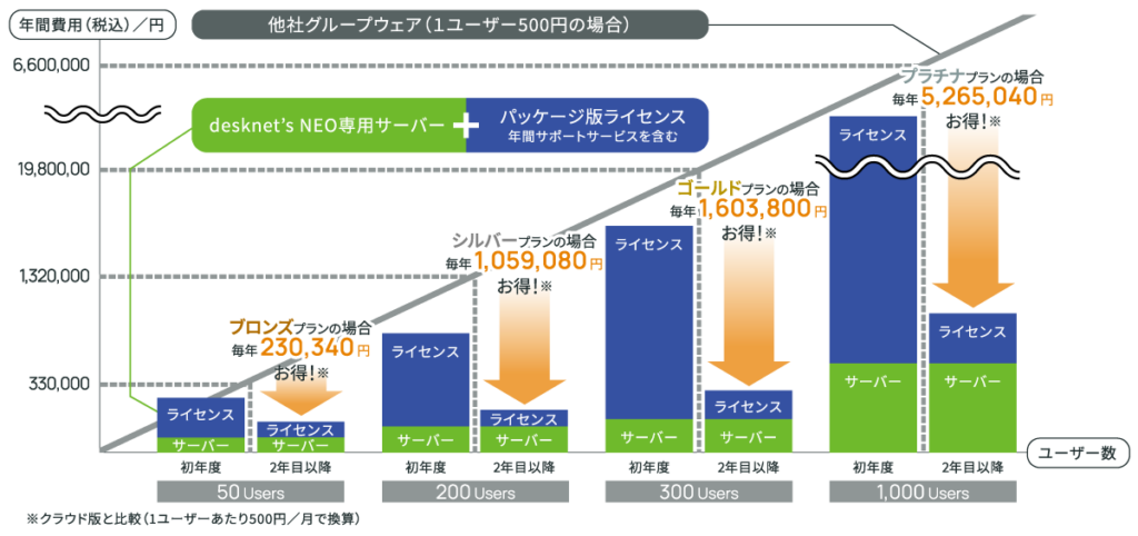 1人月額70円からご利用いただける「desknet’s NEO専用サーバー」では、パッケージ版ライセンス料金を含めても、ユーザー課金型のグループウェアよりも断然お得です。