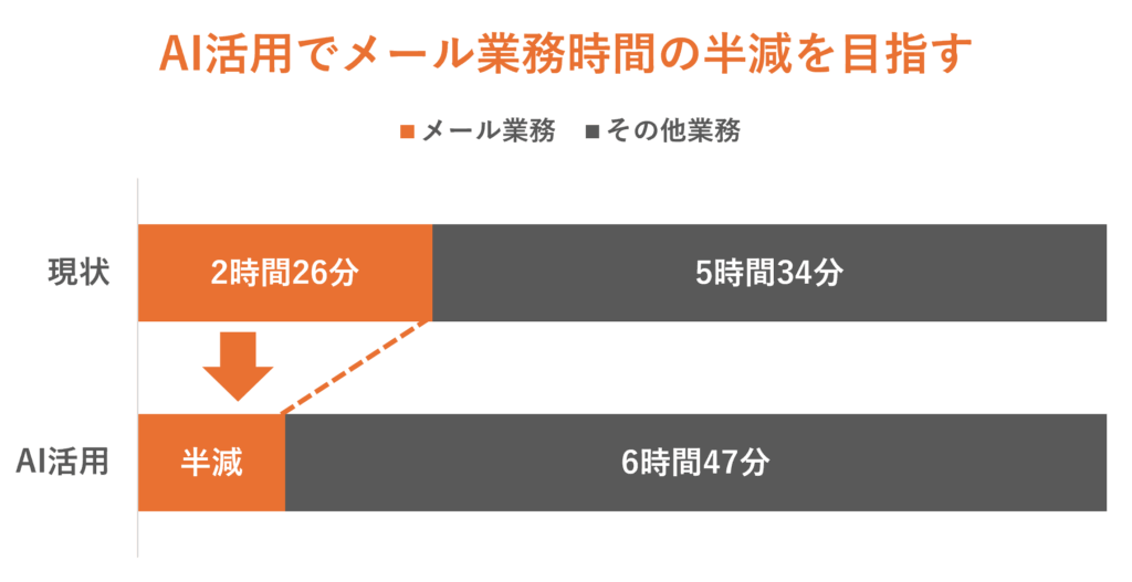一般社団法人日本ビジネスメール協会が2025年6月2日に発表した「ビジネスメール実態調査2025」によると、1日の業務時間のうち、メール送受信にかかる時間は、約3割に相当する約2時間26分にも及びます。これは、内容の確認や文章推敲に時間がかかることが主な原因です。