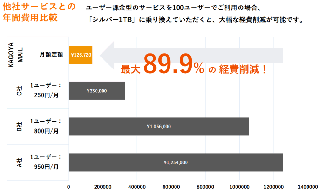 例えば、他社のユーザー課金型メールサービスを100ユーザーでご利用の場合、「シルバー1TB」に乗り換えていただくと、年間で最大89.9%の経費削減効果が見込めます。