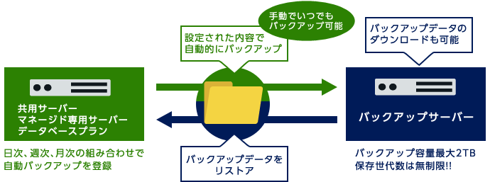 コントロールパネルでの簡単操作で、お客様のデータを指定したスケジュールで外部ストレージに自動バックアップすることができます。また、世代管理もできるので、バックアップデータが必要なったときにはクリック操作で任意の時点のバックアップデータでリストアすることが可能です。