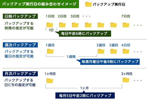 コントロールパネルで「日次、週次、月次」をスケジュール登録しておくと、バックアップ専用のサーバーに設定した内容、時刻で自動的にバックアップします。