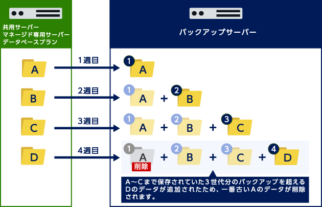 世代数を設定した分だけバックアップサーバーにデータが保存され、設定した世代数を超えると古い世代のバックアップデータが自動的に削除されて最新のバックアップデータが保存されます。
