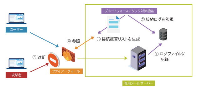 ブルートフォースアタック対策機能は、メールサーバーへのアクセス状況を監視し、一定回数以上の認証エラーを検出した場合、ブルートフォースアタックであると判断し、該当IPからのアクセスを自動で遮断します。