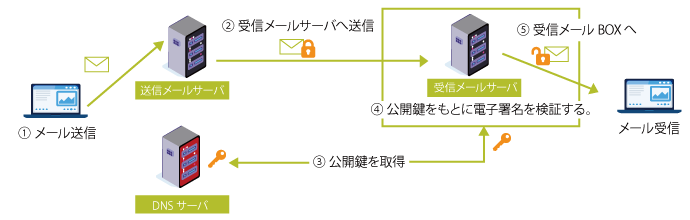 DKIMとは “DomainKeys Identified Mail” の略で、メール受信時に、送信者情報のドメインが正しいものかどうかを検証することができる仕組みでの一つで、なりすましチェックに加えメールの改ざん検知にも有効です。
