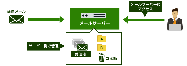IMAP (アイマップ) とは、届いたメールをメールサーバ上で管理し、メールサーバー上のメールをメールソフトに表示する方式です。メールソフトからの操作で各メールの既読状態の管理、フォルダ分けなどをメールサーバー上で行えます。メールをサーバ側で管理するため、複数の端末で同じように送信履歴や受信メールを管理できます。
