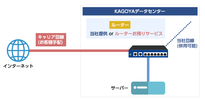 お客様の拠点の一つとして、KAGOYA データセンターにお客様ご指定のキャリア回線(NTT-FLETSなど)を引き込み、ご契約サーバーのインターネット接続用回線としてご利用いただけます。