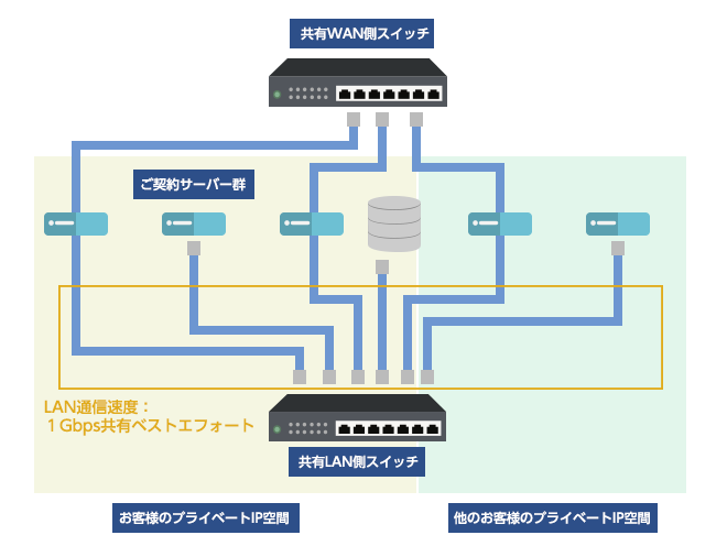 ※ LAN内の通信速度の確保や、専用のスイッチの利用をご要望の場合は、専用インテリジェントギガL2スイッチ を別途ご利用ください。 - 違うラックに収容されているサーバー間の接続も可能です。