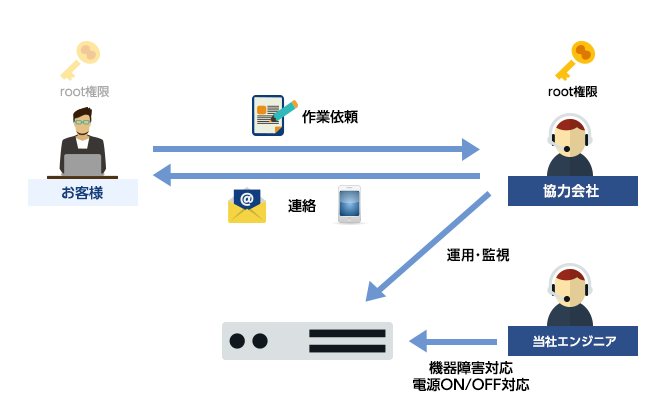 お客様に代わって、サーバーの初期構築やサーバーの24時間監視、障害対応、パッチ対応などのアップデート、各種運用作業を代行します。