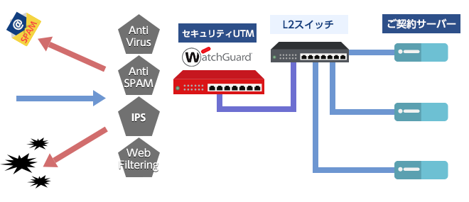 統合的なセキュリティ機能(ファイアーウォール+IPS+ウイルスチェック+SPAMチェック)を搭載した、お客様専有でご利用いただけるUTMをご提供します。