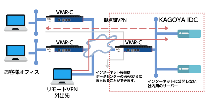お客様拠点と当社データセンターにそれぞれルーター「VMRシリーズ」を設置し、VPNを構築します。