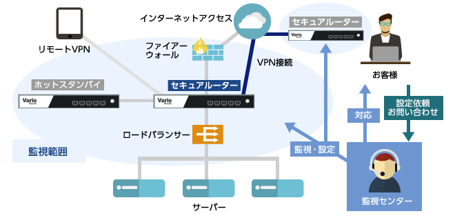 バリオセキュア社製の運用監視・設定サービス付のルーターをご利用いただけます。24時間の稼働監視に加えて、豊富なオプション機能で様々なご要望や構成に対応可能です。