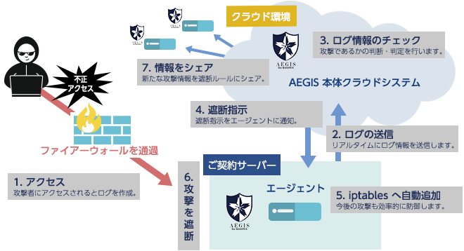「AEGIS for KAGOYA」は、お客様のサーバーにインストールしたエージェントプログラムを通じて24時間365日のセキュリティ監視を実施しており、外部からの攻撃を検知すると該当の通信の遮断および担当者へのメール通知を行います。