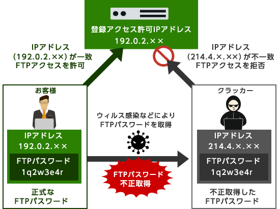 万一ご利用のPCがウイルス感染し、FTPパスワードが漏えいするような事態が発生した場合でも、許可されていないIPアドレスからのFTP接続は制限されるため、サーバー内の大切なデータへの不正アクセスや改ざんのリスクを減らすことができます。