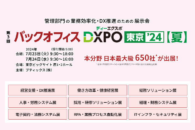 | イベント名 | バックオフィスDXPO東京’24【夏】 |